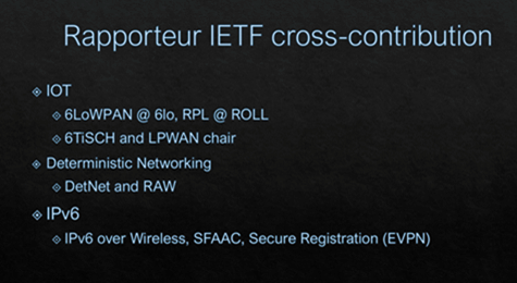 • Many rapporteurs and contributors in IPE are also heavily involved and contribute to the IETF, granting the above cross-contribution alignment with IETF standards. An example being Work Item DGR/IPE-004 on IPv6 based enterprise networking and Industrial Internet for which Pascal is the Rapporteur, includes several references to IETF standards.
