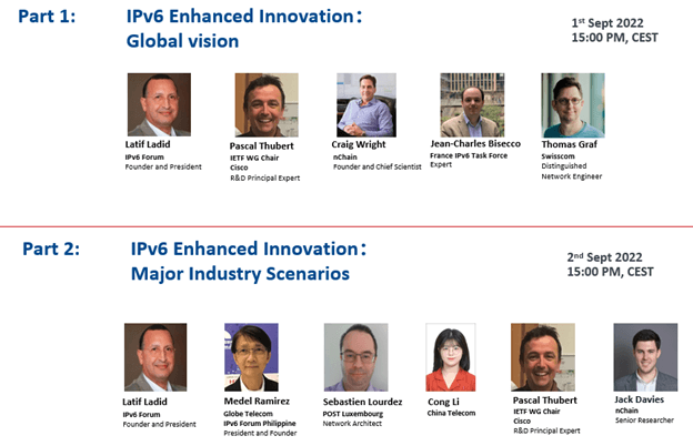 2 ETSI webinars ‘IPv6 Enhanced Innovation Global Vision’ and ‘Major Industry Scenarios’ took place on September 1st and 2nd respectively. Experts from government institutions, operators, manufacturers and research institutes, shared their vision and the progress made to date within ETSI ISG (Industry Specification Group) IPE (IPv6 Enhanced innovation).